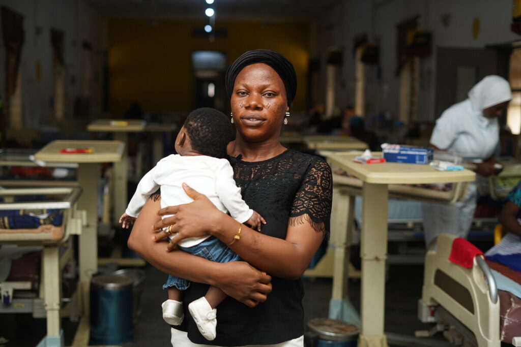 A woman on a maternity ward in Nigeria holds her baby close to her chest.